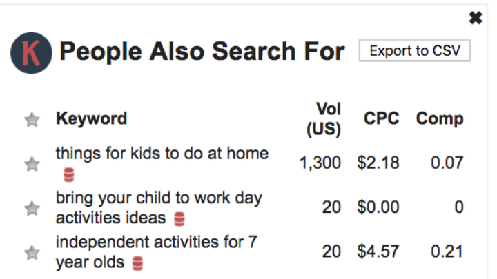 This term – things for kids to do at home – is highly searched and has low competition. What’s great about this Chrome Extension is that on the side, it lists related keywords.