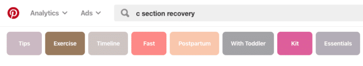 For example, let’s say you write a post on C-section recovery tips. Type into Pinterest c-section and see what results they suggest. From there you can get more ideas from the tiles under the keyword.