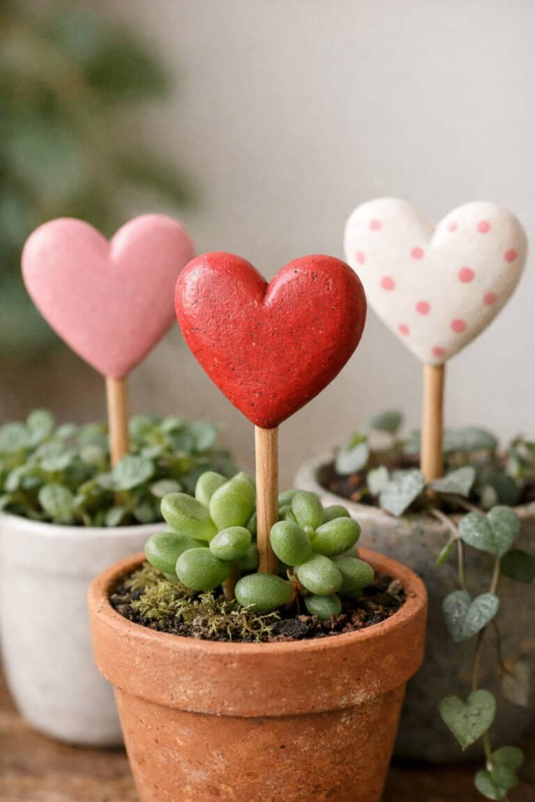 Just attach a clay heart to a wooden stake and let it dry, then paint short words like “Grow,” “Bloom,” or even someone’s initials.